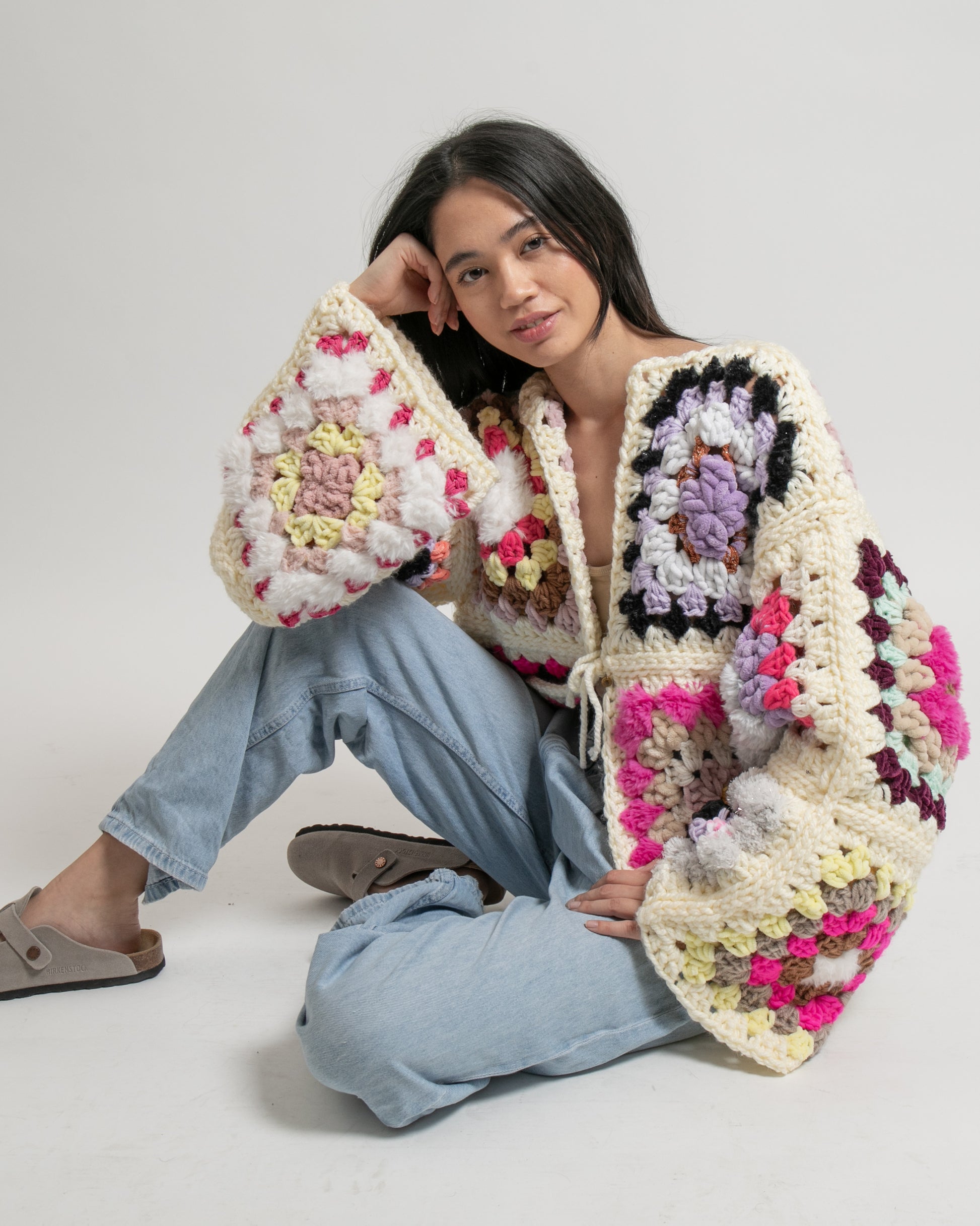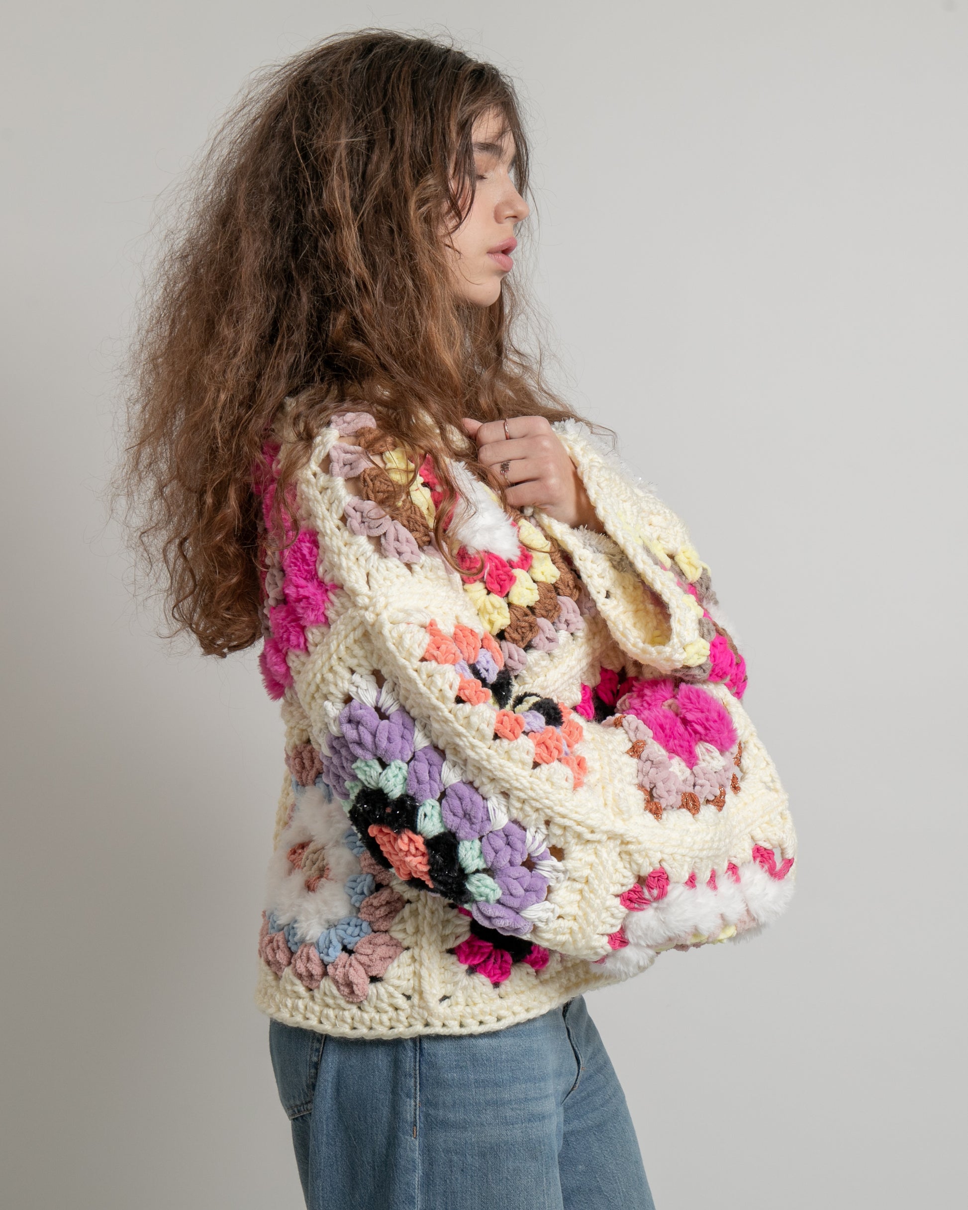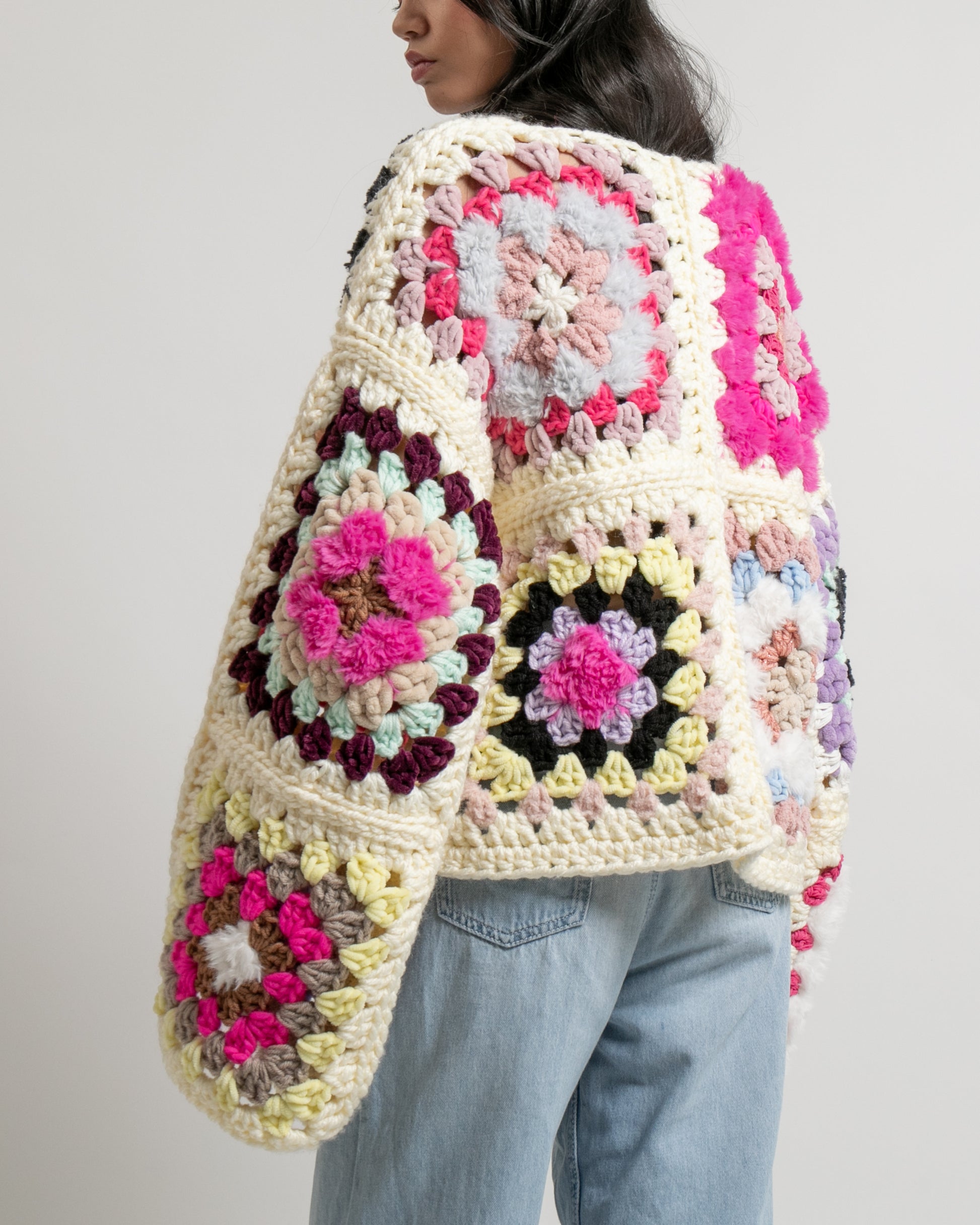 Entièrement crochetée à la main à Marseille, elle a été créée à l’instinct. Les couleurs et les textures se répondent naturellement, granny après granny, sans chercher la perfection ni la symétrie.