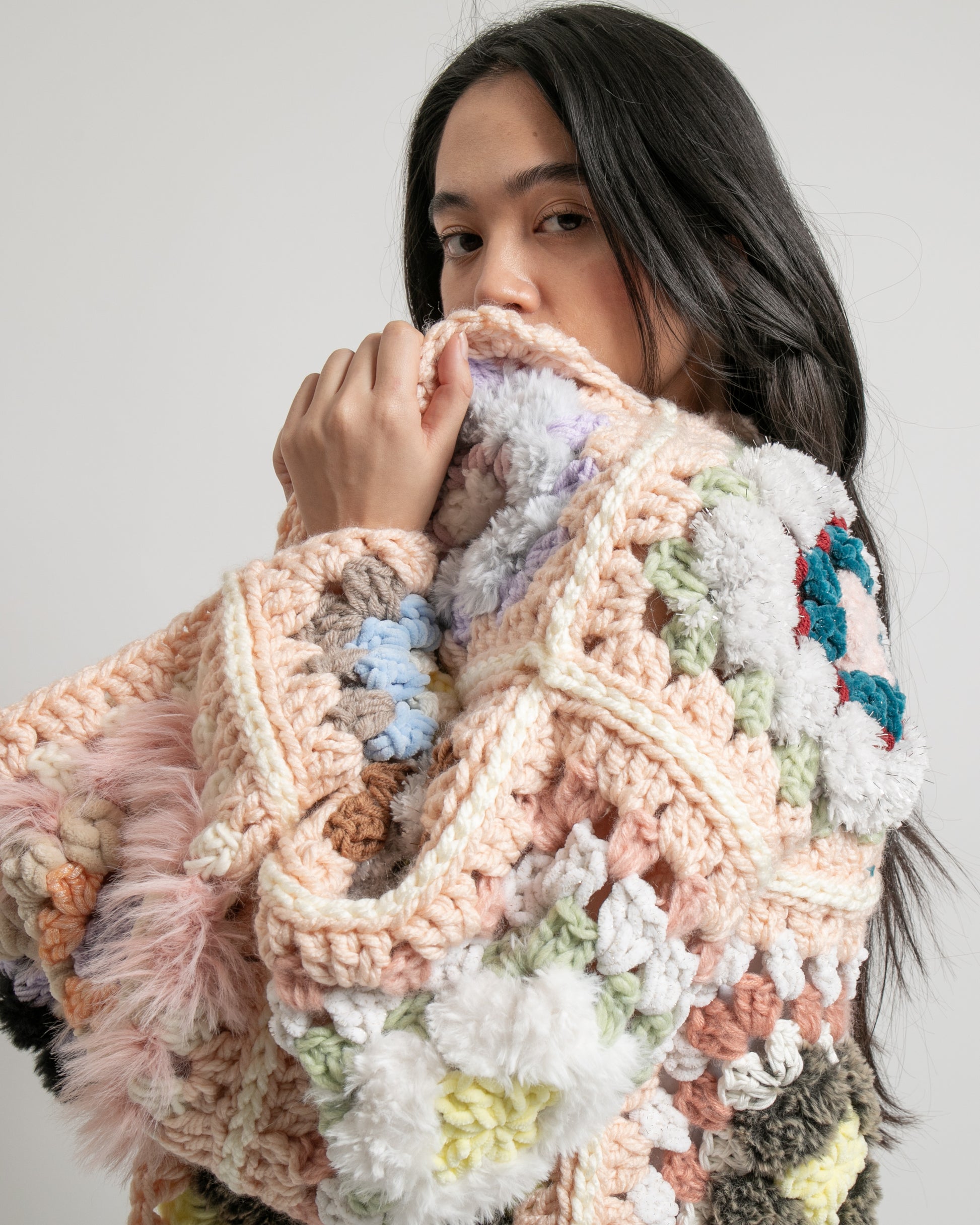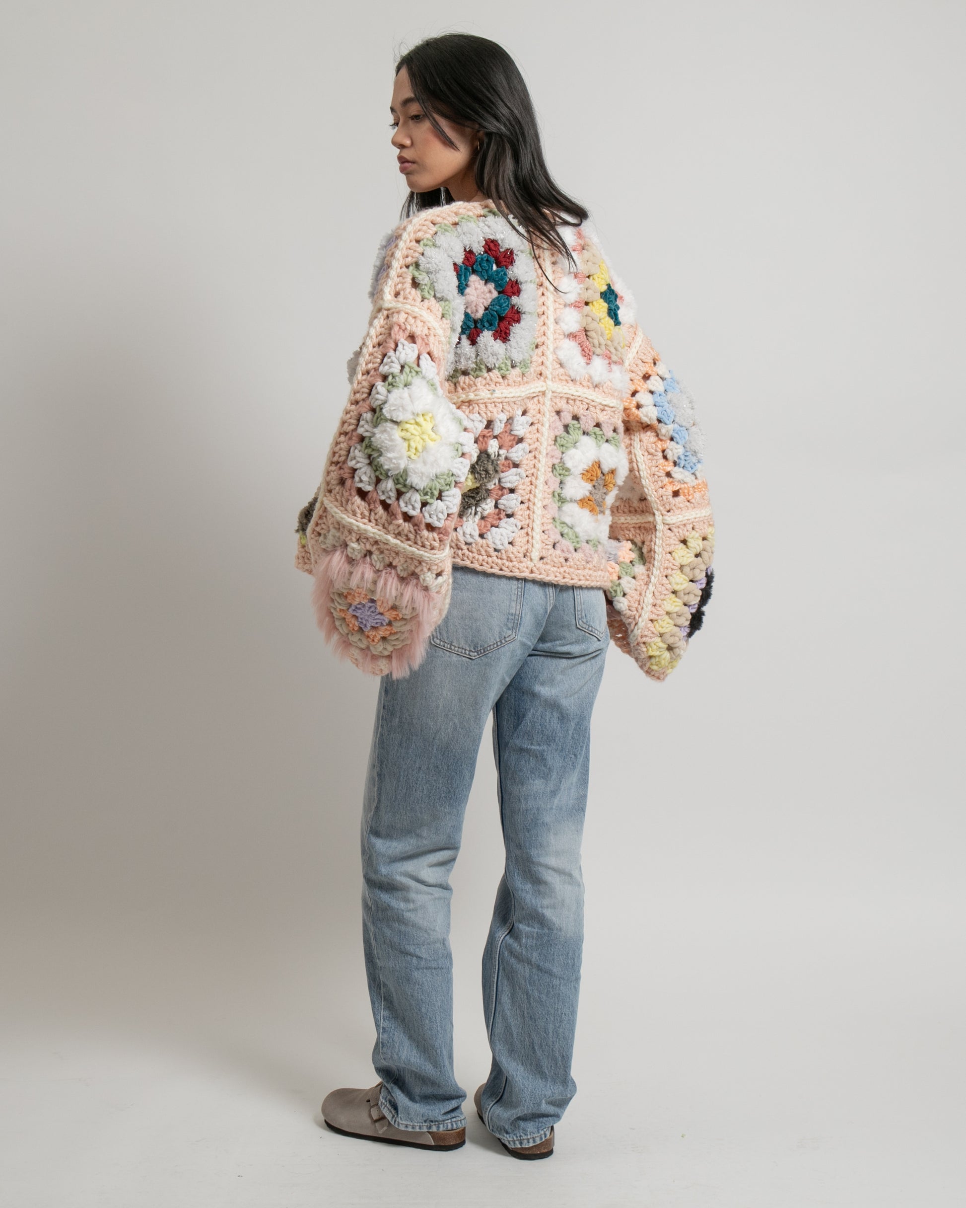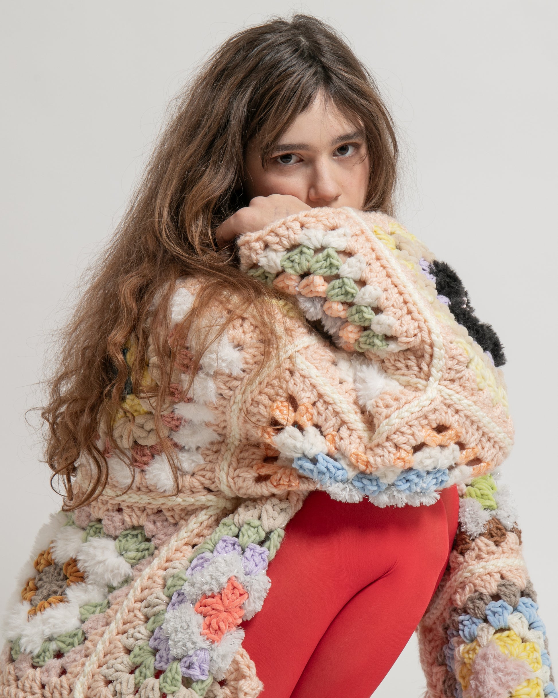 Entièrement crochetée à la main à Marseille, elle mêle des tons poudrés, des fils texturés et des détails presque fluffy, créant un contraste subtil entre douceur et caractère. Chaque granny a été pensé comme un fragment à part entière, assemblé pour former une veste unique.