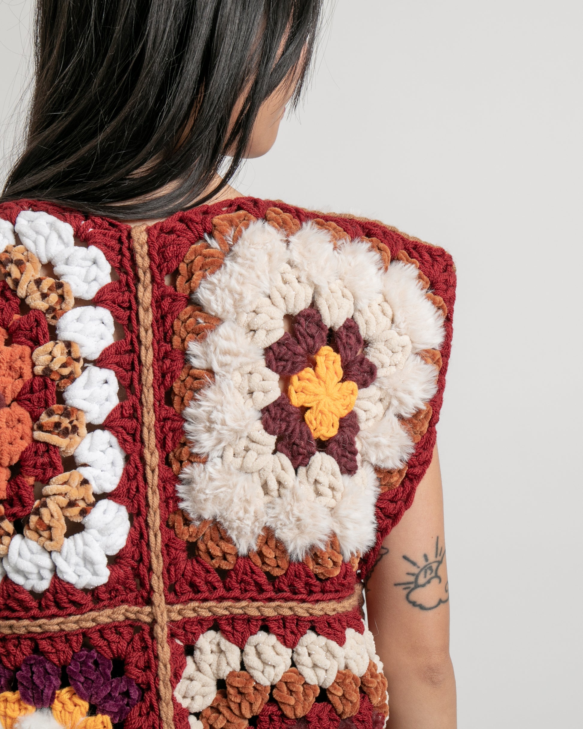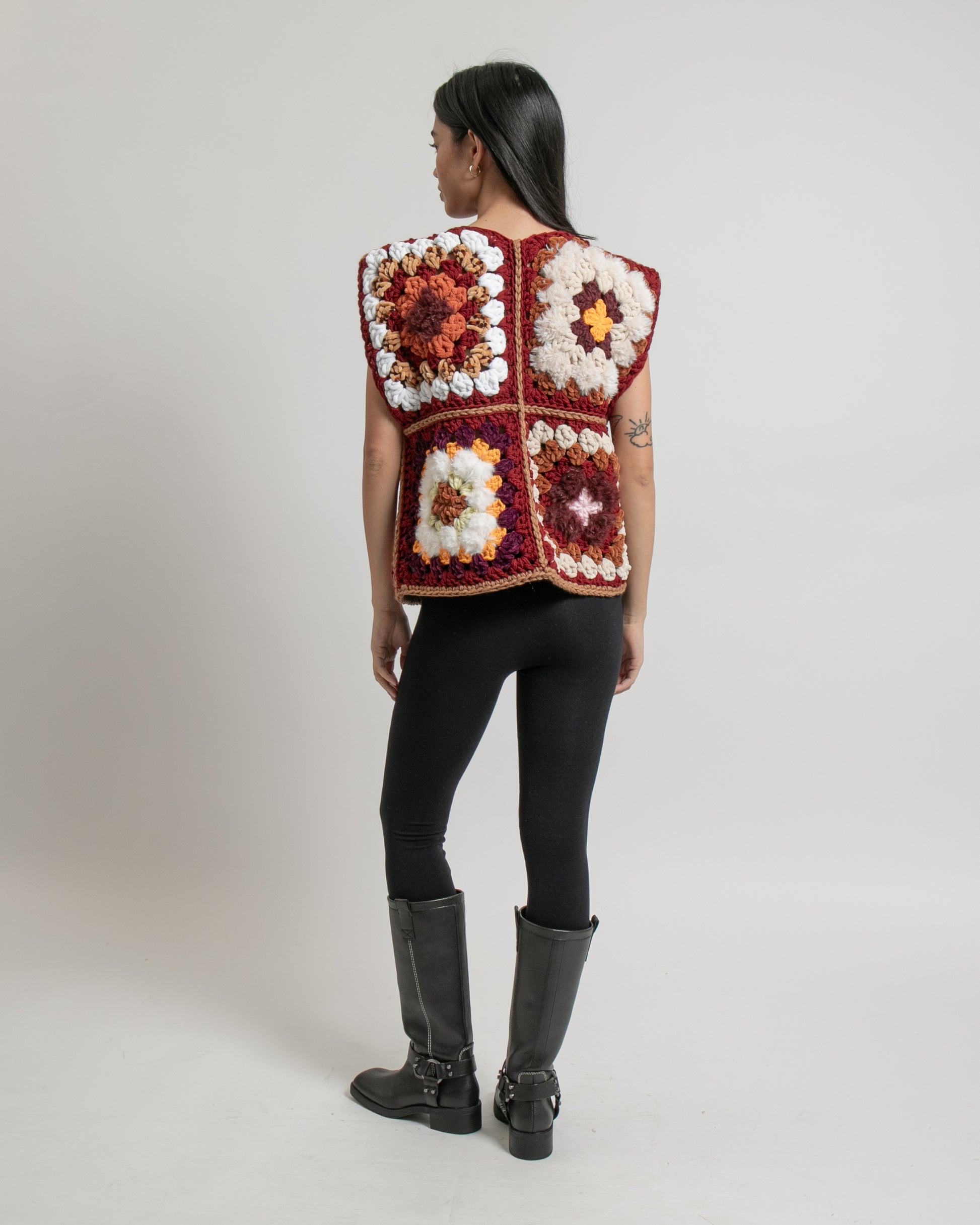 Les granny sont visibles et texturés, dans une palette chaude mêlant brique, écru et caramel. La pièce apporte de la matière et du relief à une tenue, sans la surcharger.